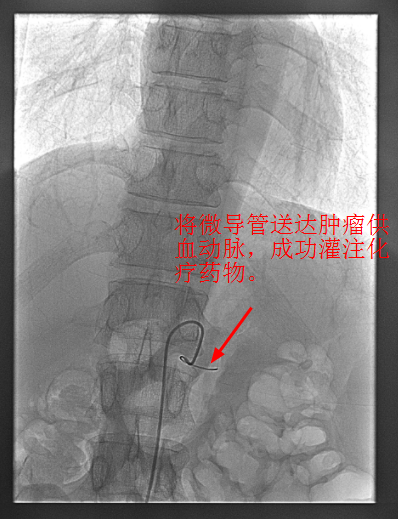 4月30日下午,李旭丹主任與胡志華主任上台實施介入化療術,在DSA造影下,清晰可見胰腺腫瘤的供血動脈,專家們将微導管經股動脈穿刺送達瘤體的供血動脈,成功将化療藥物灌注至瘤體,順利完成手術。術後,患者症狀明顯好轉,并于5月4日順利出院。